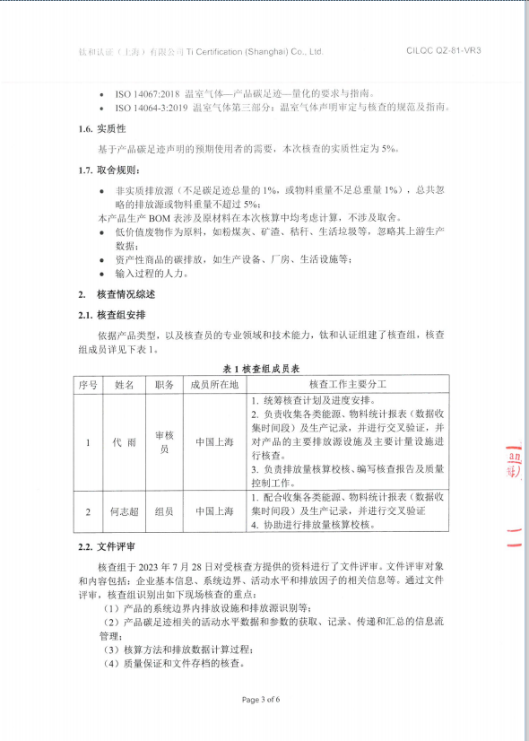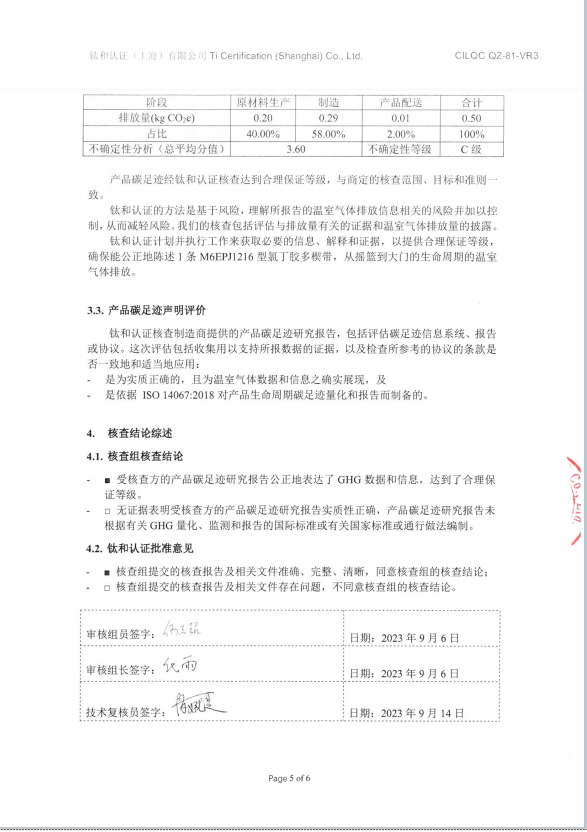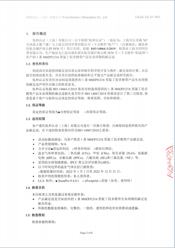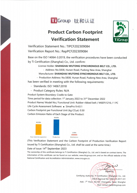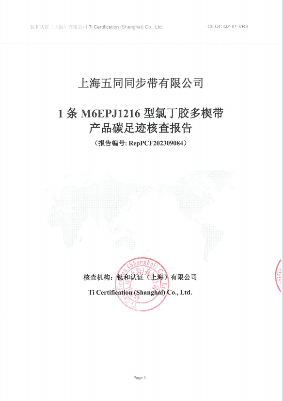 1条氯丁胶多楔带(型号:M6EPJ1216)产品碳足迹核查报告及中英文声明